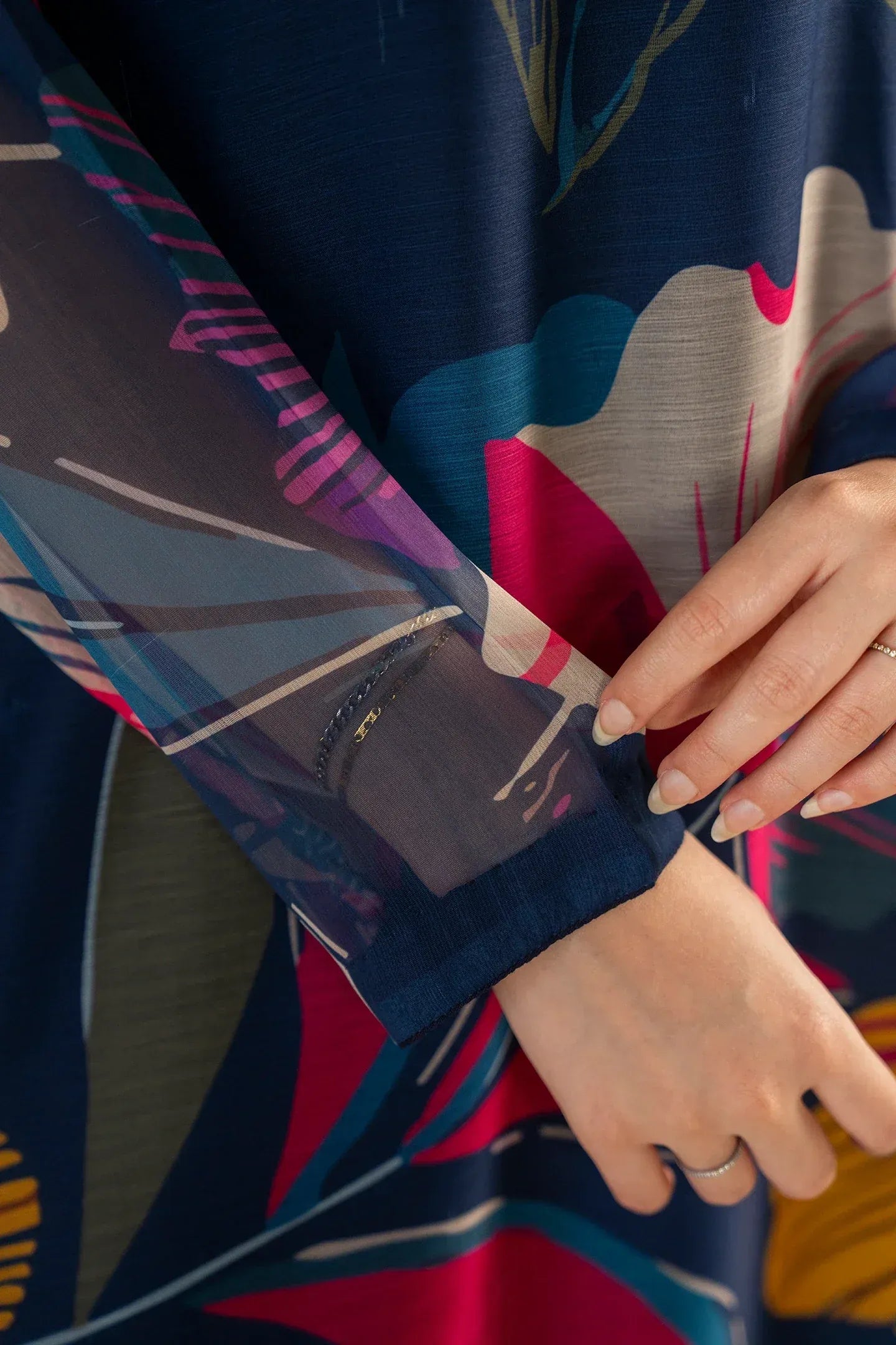 Black base with oversized magenta florals. Round neck, full sleeves, and side slits. Relaxed fit in textured poly crepe with lined body.