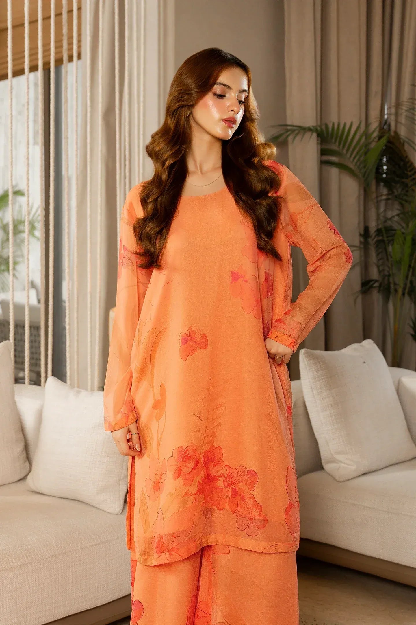 Warm coral base with abstract floral detailing. Soft crepe fabric in a relaxed fit. Round neck, side slits, and straight-leg trousers.