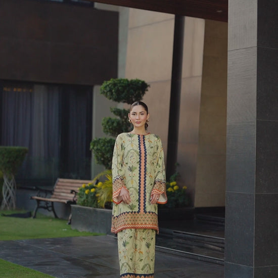 A graceful ensemble in soft lime green, adorned with intricate botanical and wildlife-inspired motifs. The scalloped details and earthy hues blend tradition with contemporary elegance, making it a perfect pick for breezy, effortless style.