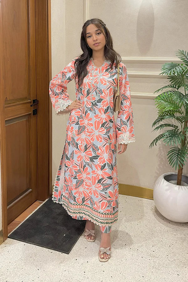 This Cerulean 2-piece pret set blends elegance with everyday charm in soft Poly Lawn fabric. The round V-neckline is beautifully embroidered, offering a refined focal point. Loose sleeves are adorned with embroidered hems and delicate lace detailing for a graceful finish. The long shirt features printed borders with lace accents on the side slit and hem. Paired with a straight contrast printed trouser, this outfit brings a fresh, coordinated look ideal for the season.