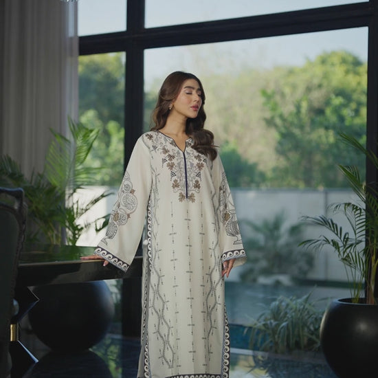 An ivory kurta with delicate botanical and symmetrical prints in deep sapphire and taupe. The scalloped borders and fluid silhouette add timeless elegance, paired with matching printed pants for effortless summer sophistication