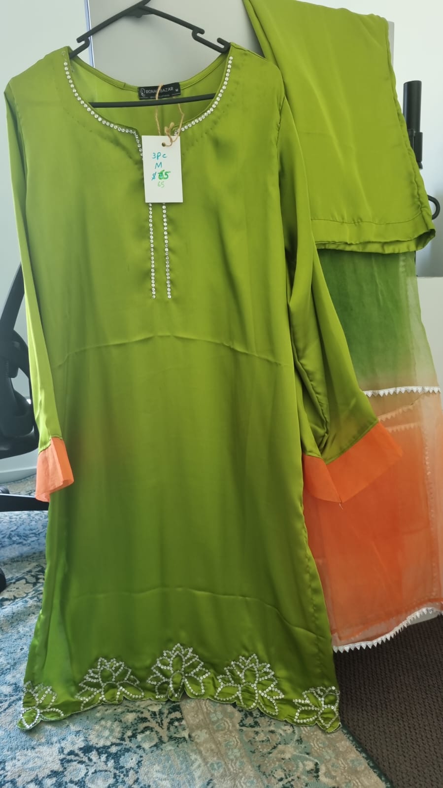 Paired with a graceful two-tone organza dupatta finished with classic gotta lace, and plain silk trousers to complete the look — because sometimes, simple really is superior.