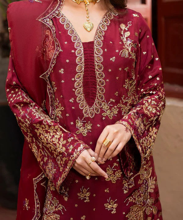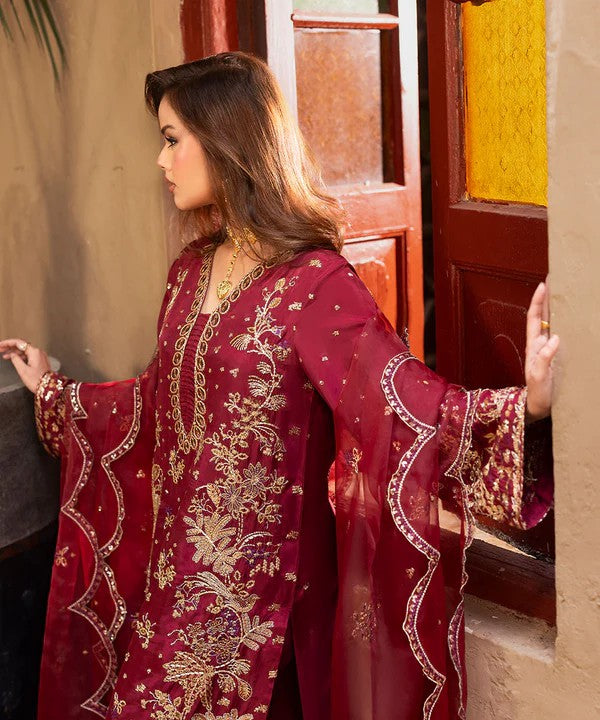Paired with straight-cut habatai silk pants and a gracefully embroidered organza dupatta, the outfit achieves a perfectly balanced and refined look. An ideal choice for festive occasions, formal gatherings, and special celebrations.