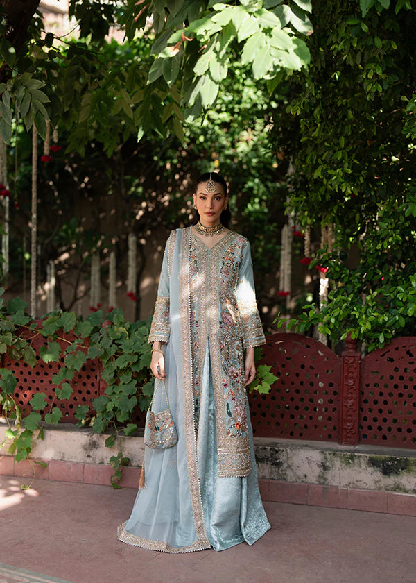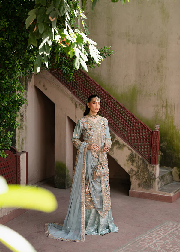 A vision of ethereal serenity in the softest hue of ice blue ❄️. Handcrafted with intricate zari, resham, and sequins, every motif glistens like morning dew upon silk threads ✨. The long, flowing silhouette paired with a gleaming dupatta and potli whispers of old-world charm and quiet grandeur 🌸💎