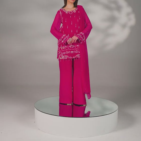 Turn heads with this stunning shocking pink chiffon ensemble, featuring a beautifully embroidered short shirt adorned with delicate embellishments on the front and sleeves. Paired with chic raw silk plazo pants and a chiffon dupatta trimmed with elegant lace detailing, this outfit perfectly balances modern charm with traditional grace β ideal for festive and semi-formal occasions.