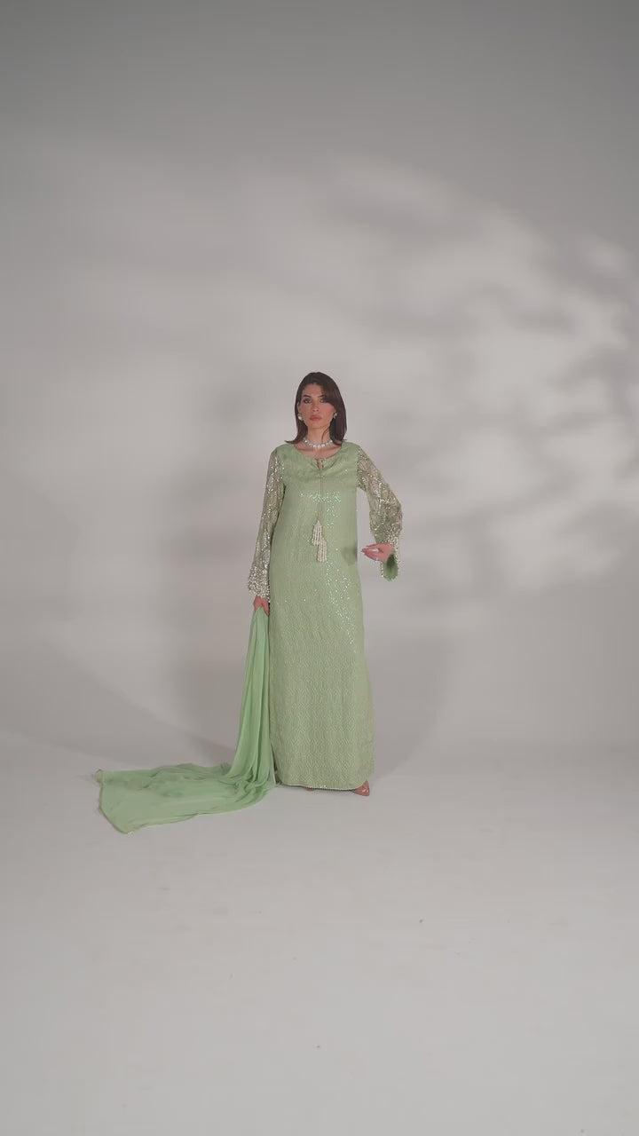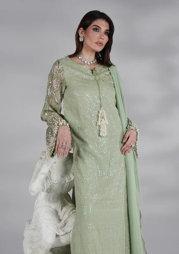 Effortlessly elegant — this mint green chiffon ensemble features a beautifully embroidered long shirt with delicately embellished sleeves and a handcrafted dori tassel neckline for a touch of traditional artistry. Paired with graceful raw silk plazo pants and a chiffon dupatta detailed with fine lace, this outfit is the perfect blend of sophistication and charm for any festive or semi-formal occasion.