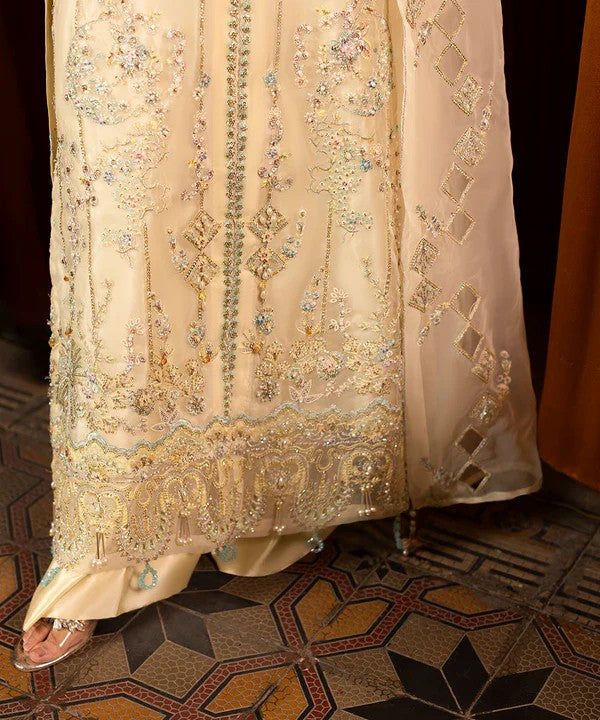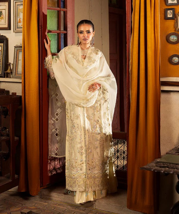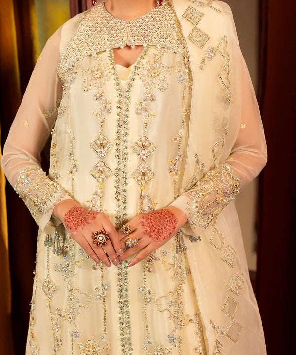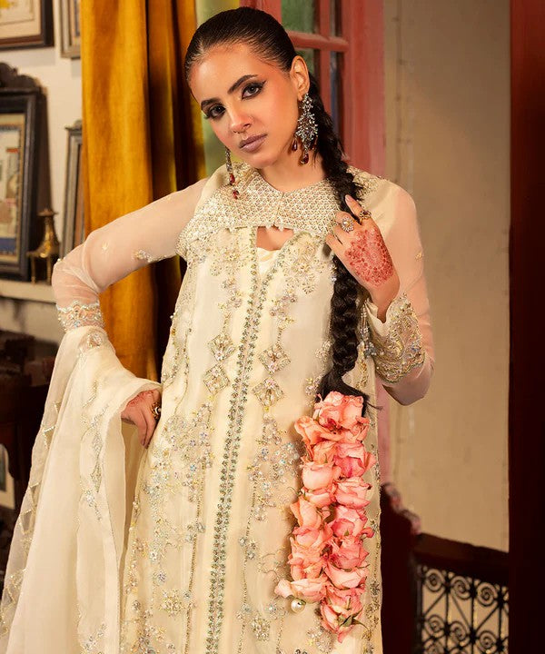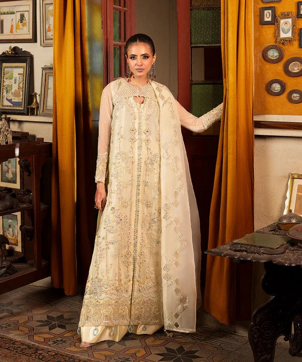 This elegant ivory ensemble features a fully embroidered organza shirt enhanced with intricate handwork, elevating the overall charm of the outfit. The coordinated jacket adds depth and a refined statement, while the delicately embroidered dupatta completes the look with subtle elegance.