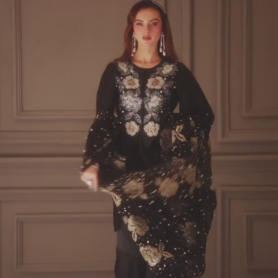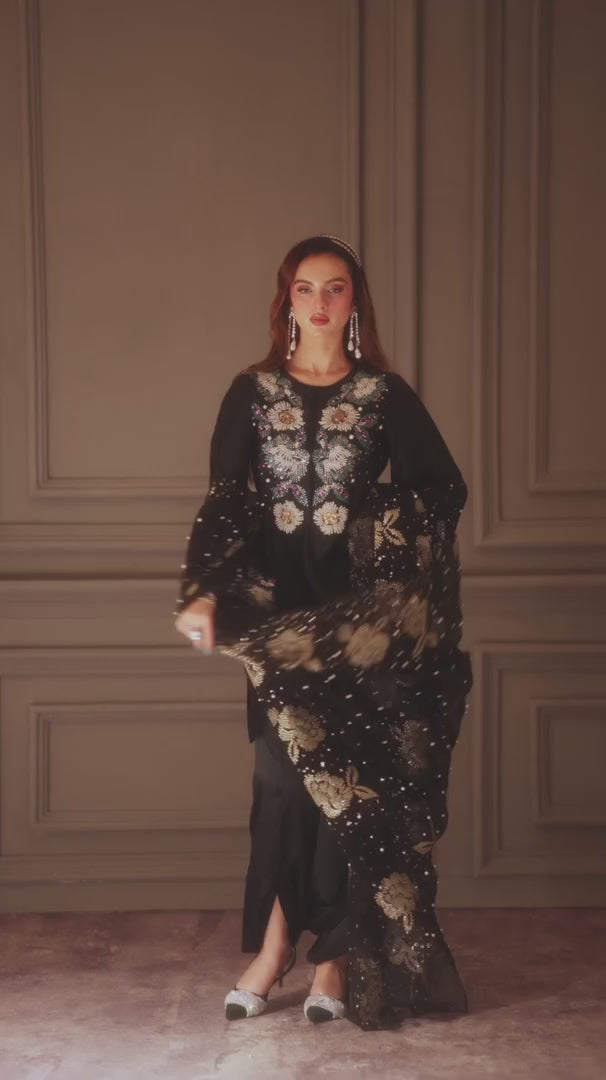 An elegant stitched black luxury dress, perfect for formal and festive occasions. The design blends timeless craftsmanship with refined detailing for a graceful statement look.