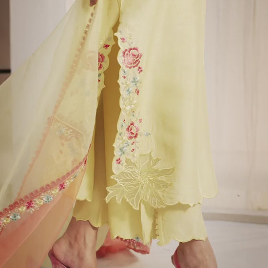LARAÂ is a 3-piece butter yellow raw silk ensemble with statement colorful embroidery on the sides, scalloped neckline and sleeves. Featuring flared pants with a side slit & pearl detailing. Paired with a two-tone organza embroidered dupatta.