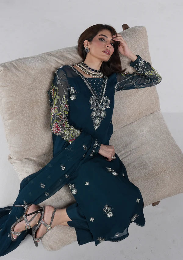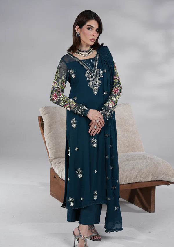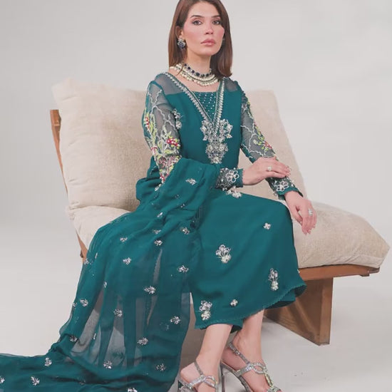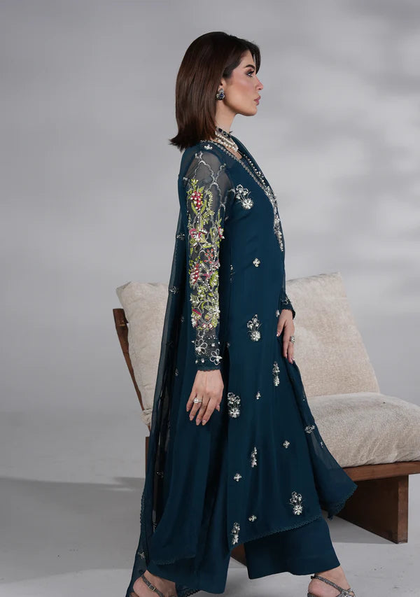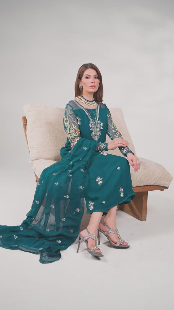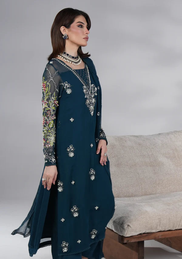 Step into timeless elegance with this teal green chiffon ensemble, beautifully embroidered and enhanced with a delicately embellished neckline and sleeves. Paired with classic raw silk capri pants and a chiffon dupatta adorned with intricate lace detailing, this outfit blends sophistication with effortless charm β perfect for any festive or semi-formal occasion.