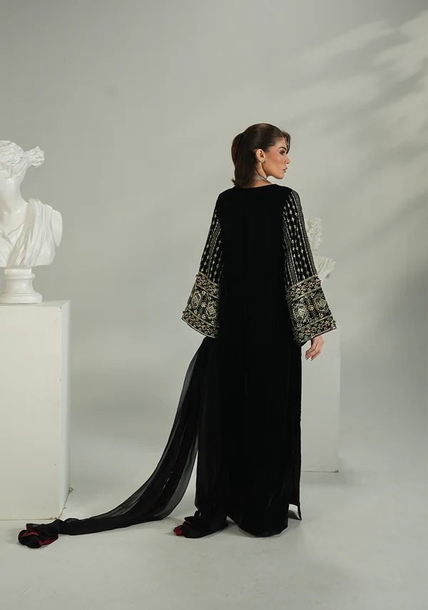 Classic and statement-making in deep black β this velvet long shirt features intricate embroidery with refined embellishments on the neckline and sleeves, creating a timeless festive silhouette. Paired with tailored raw silk trousers and a soft chiffon dupatta finished with lace detailing, this ensemble is perfect for elegant evening and formal wear.