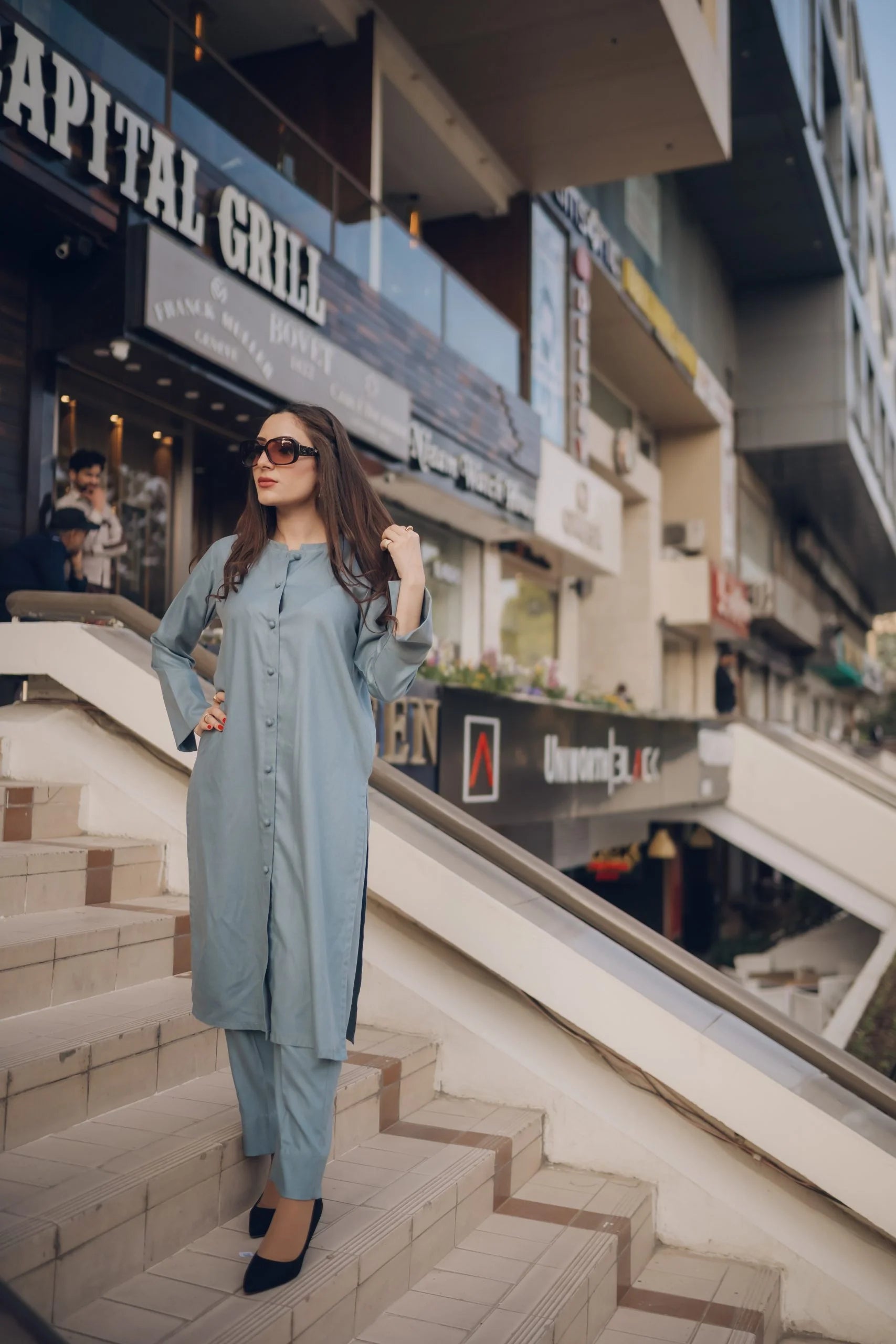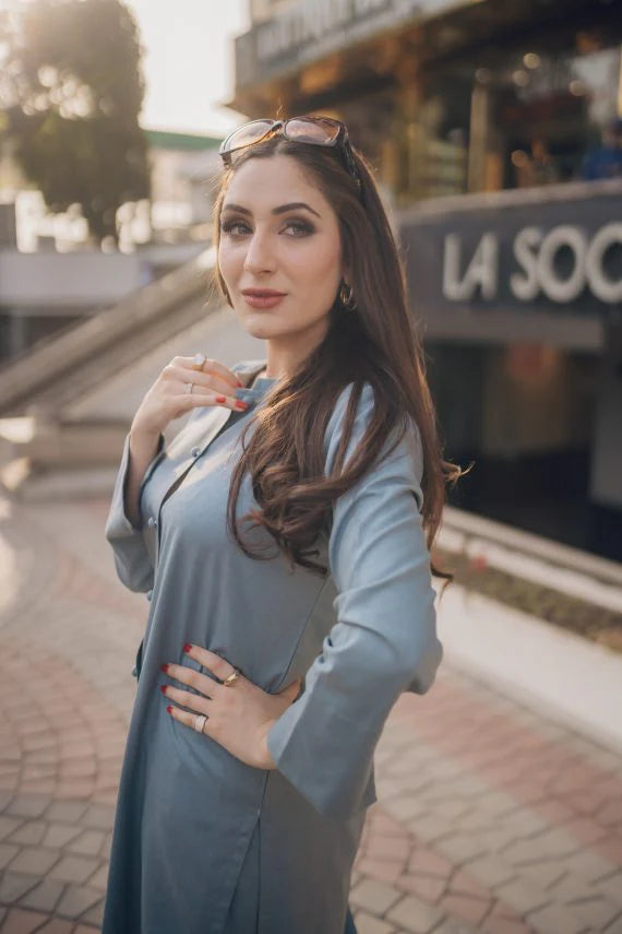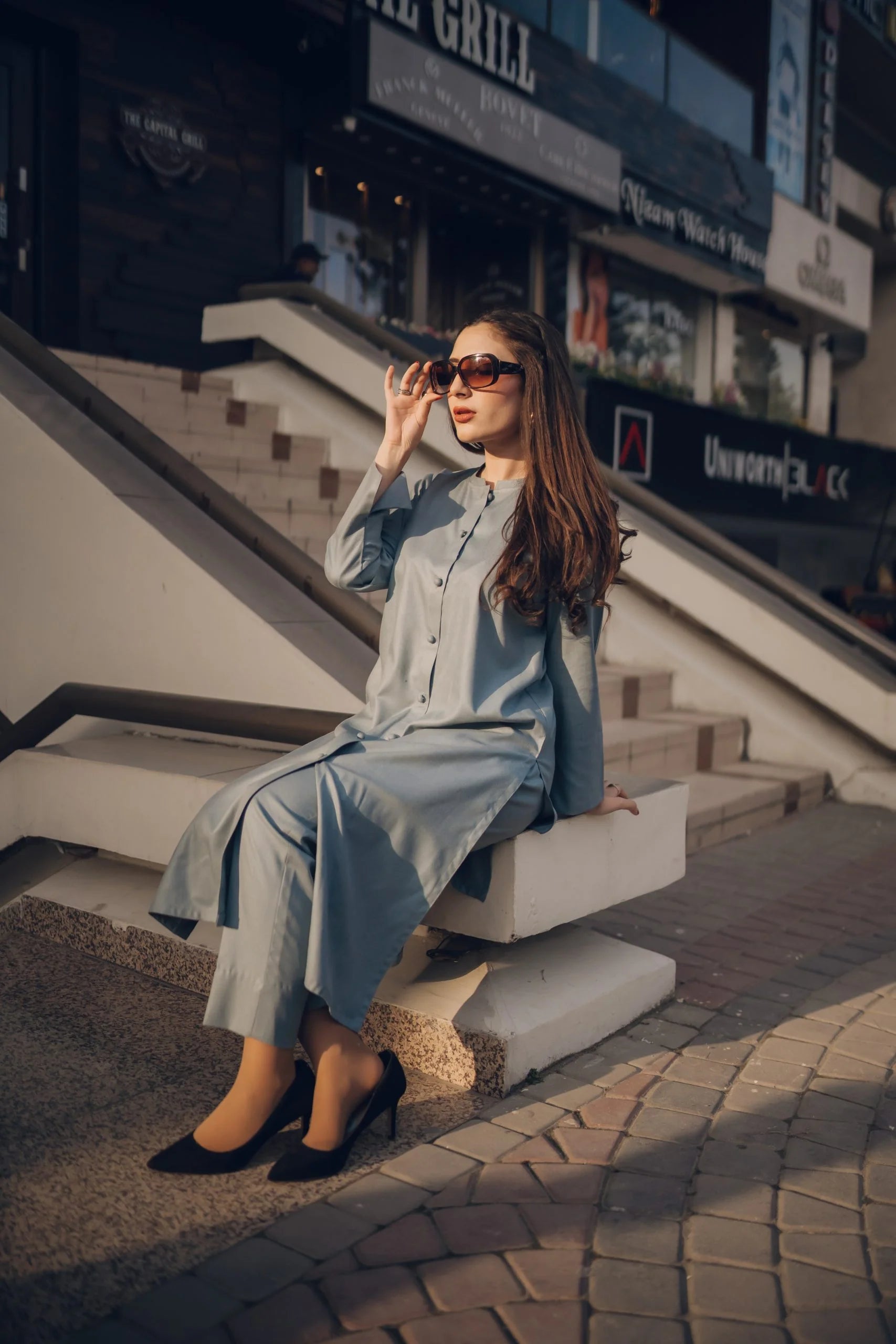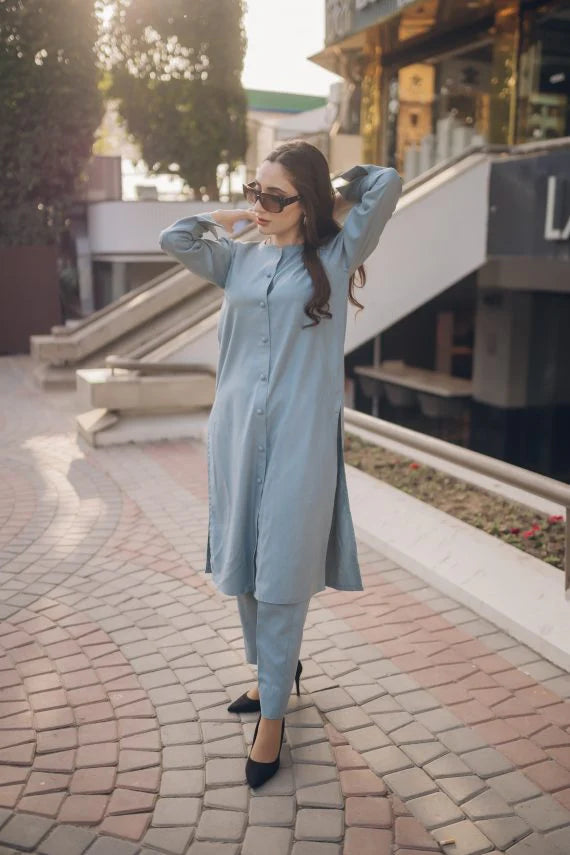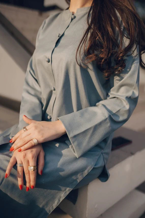 Long front open shirt with self buttons on the front, ban neckline, and slightly loose sleeve. Perfect to complete your casual daily look.