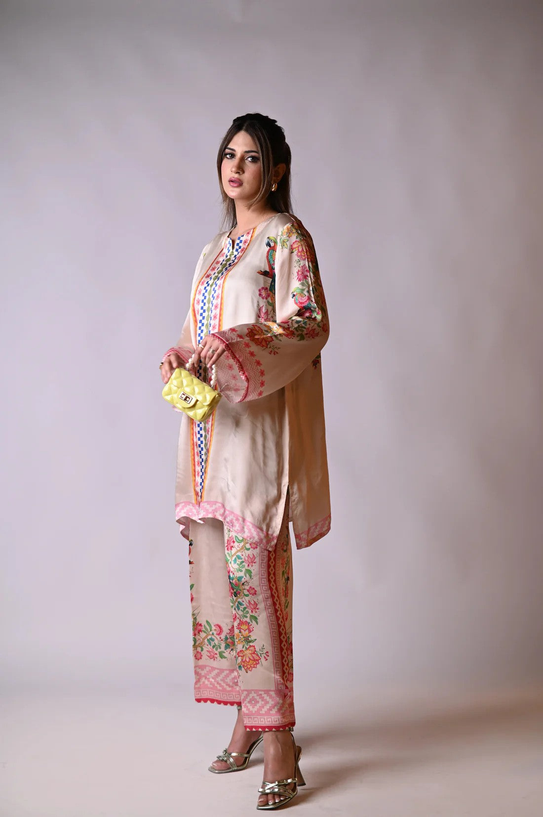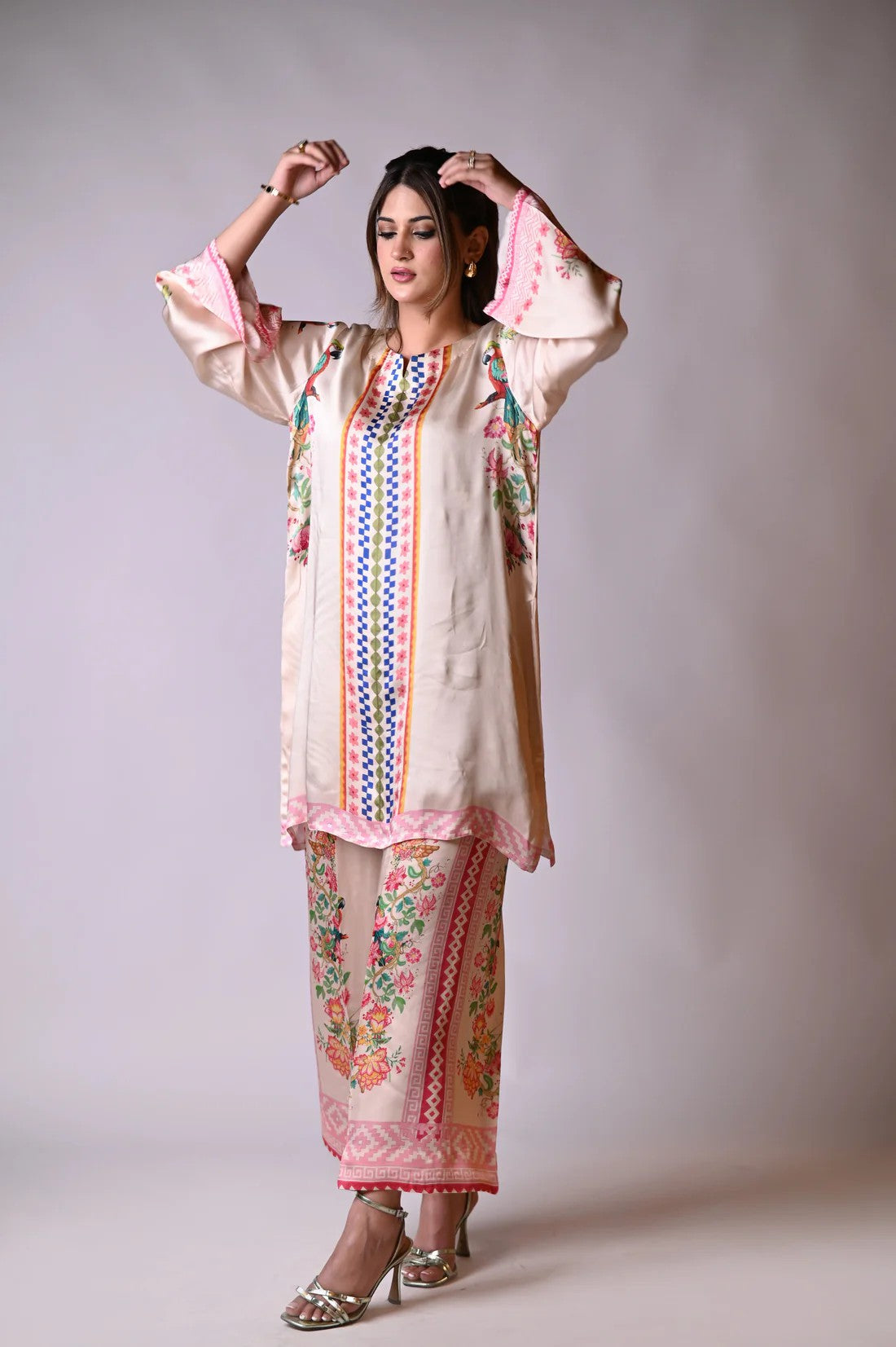 Add a touch of tropical elegance to your wardrobe with this vibrant printed silk cord set, adorned with lush floral and vivid parrot motifs. Crafted from premium silk, the set drapes beautifully on the body, offering a soft, luxurious feel and effortless movement. The playful yet sophisticated print brings nature to life, blending botanical charm with exotic flair.