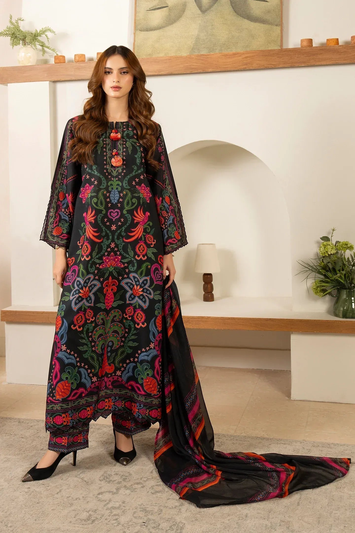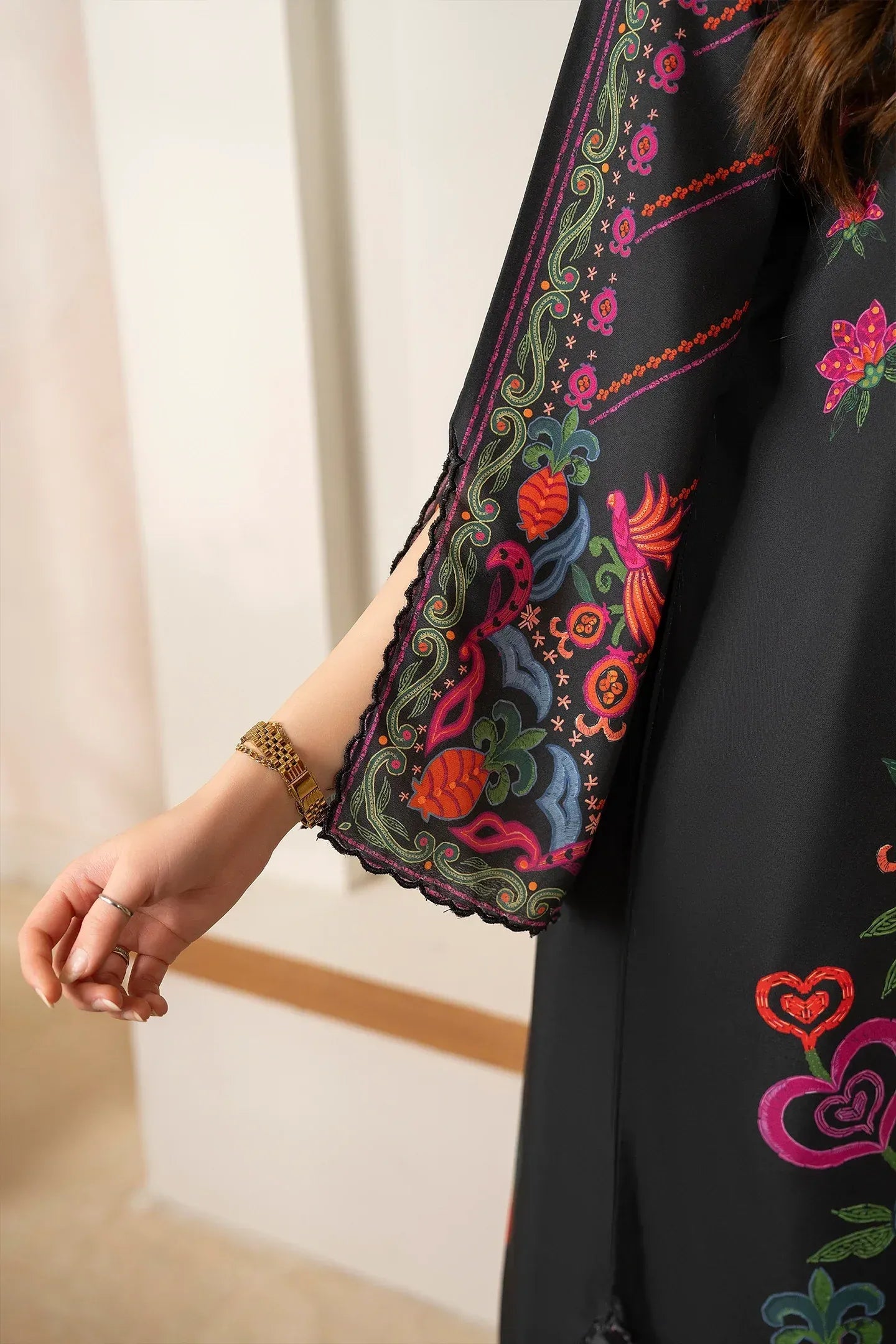 Black canvas adorned with multicolor ornamental and folk inspired motifs.