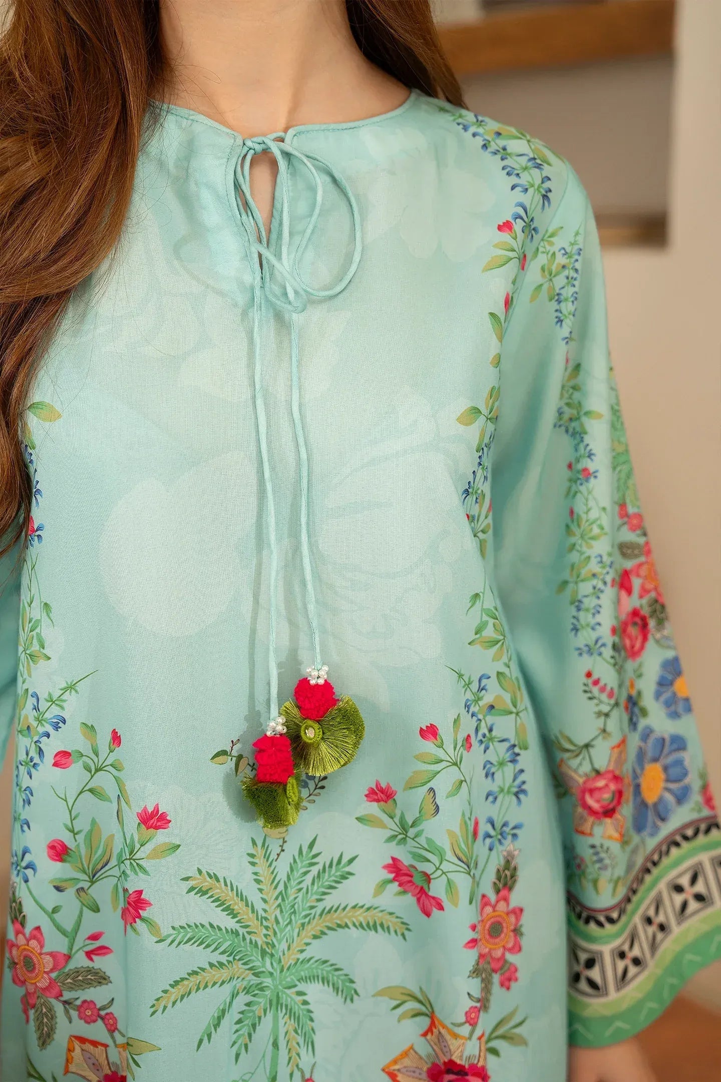 Aqua blue base with vibrant floral prints and hot pink contrast dupatta.