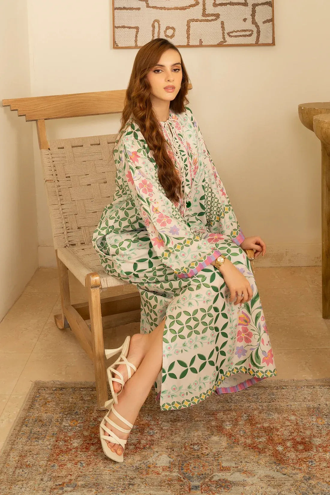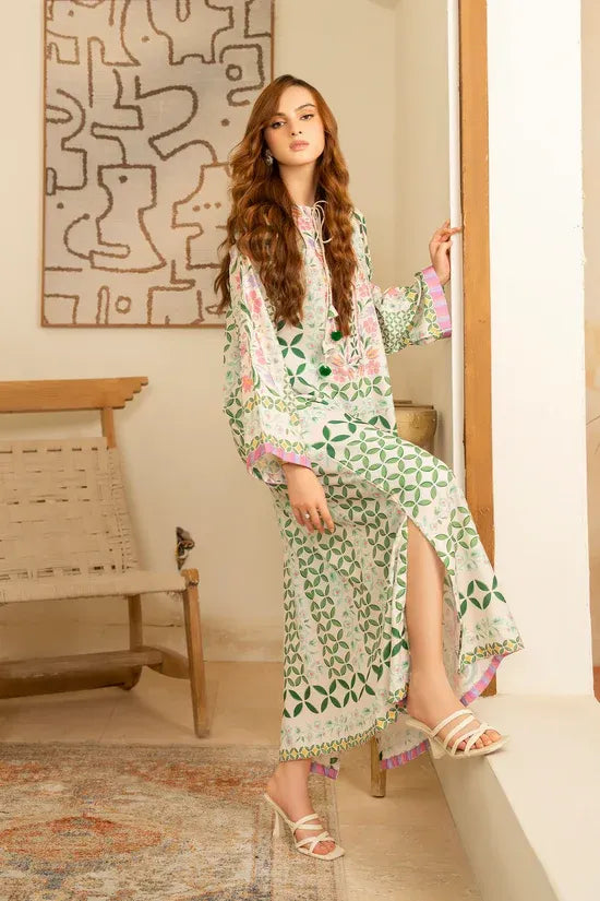 Ivory white geometric base with green floral accents and pastel dupatta.