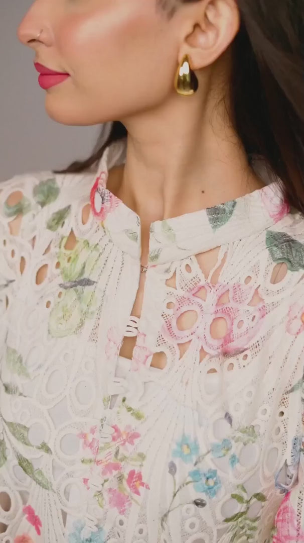Infuse colour and craftsmanship into your wardrobe with the ASR-20 Multi-Floral Shiffli Chikan Kaftan Shirt. Designed for the woman who embraces vibrant individuality, this kaftan-style kurta showcases intricate cutwork floral motifs in a cascade of vivid tones—an eye-catching blend of traditional embroidery and modern ease.
